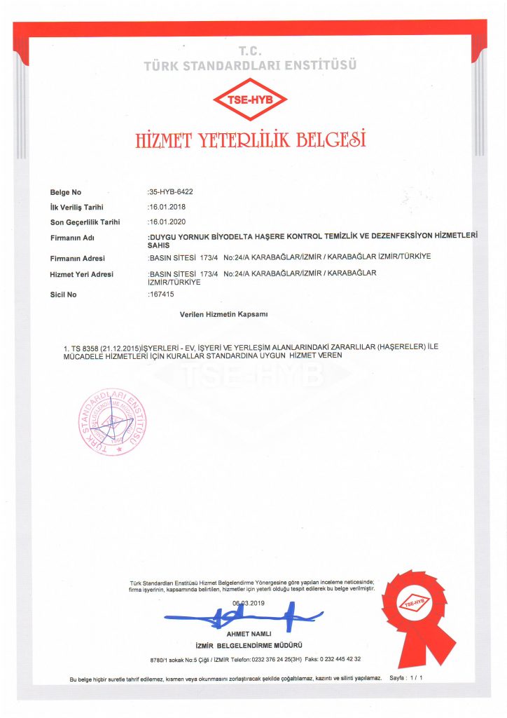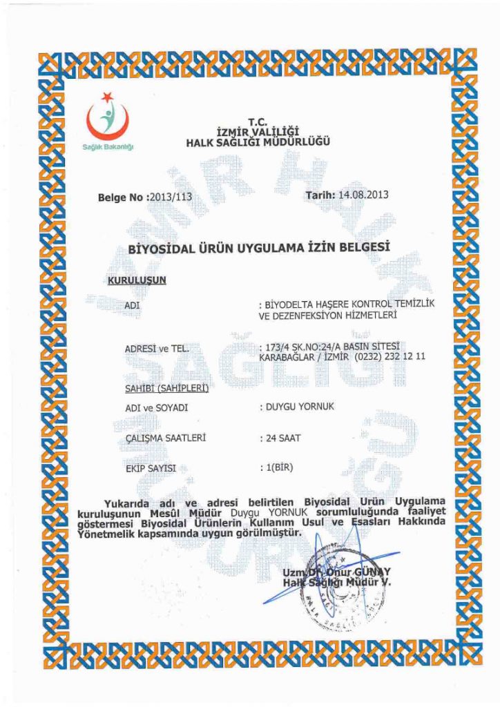 İlaçlamalarımızda, Sağlık Bakanlığı'nın onayladığı alet, ekipman ve biosidal ilaçlarla hizmet vermekteyiz.